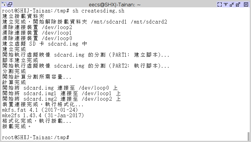 SD_IMAGE=sdcard.img SD_IMAGE_SIZE=1G SD_IMAGE1=sdcard.img1 SD_IMAGE2=sdcard.img2 PART1_SIZE=100M PART1_OFFSET=1 PART1_SECTORS=1 PART1_BLOCKS=1 PART2_OFFSET=1 PART2_SECTORS=1 PART2_BLOCKS=1 LOOP0=/dev/loop0 LOOP1=/dev/loop1 LOOP2=/dev/loop2 MOUNT_DIR1=/mnt/sdcard1 MOUNT_DIR2=/mnt/sdcard2 echo "建立掛載資料夾" mkdir $MOUNT_DIR1 2>/dev/null mkdir $MOUNT_DIR2 2>/dev/null sleep 1 echo "建立完成,開始解除掛載資料夾 $MOUNT_DIR1 $MOUNT_DIR2" umount $MOUNT_DIR1 2>/dev/null umount $MOUNT_DIR2 2>/dev/null sleep 1 echo "清除連接裝置 $LOOP2" losetup -d $LOOP2 2>/dev/null echo "清除連接裝置 $LOOP1" losetup -d $LOOP1 2>/dev/null echo "清除連接裝置 $LOOP0" losetup -d $LOOP0 2>/dev/null sleep 1 echo "建立虛擬 SD 卡 $SD_IMAGE 中" dd if=/dev/zero of=$SD_IMAGE bs=$SD_IMAGE_SIZE count=1 2>/dev/null echo "建立完成" sleep 1 echo "開始執行虛擬映像 $SD_IMAGE 的分割 (PART1: 建立腳本)..." cat > /tmp/fdisk.cmd << EOF n p 1 +$PART1_SIZE t b n p 2 w EOF echo "腳本建立完成" sleep 1 echo "開始執行虛擬映像 $SD_IMAGE 的分割 (PART2: 執行腳本)..." fdisk $SD_IMAGE < /tmp/fdisk.cmd >/dev/null echo "分割完成" sleep 1 echo "開始計算分割所需容量..." PART1_OFFSET=`fdisk -lu $SD_IMAGE | grep $SD_IMAGE1 | tr -s ' ' | cut -d\ -f 2` PART1_SECTORS=`fdisk -lu $SD_IMAGE | grep $SD_IMAGE1 | tr -s ' ' | cut -d\ -f 4` PART1_BLOCKS=`expr $PART1_SECTORS / 2` PART2_OFFSET=`fdisk -lu $SD_IMAGE | grep $SD_IMAGE2 | tr -s ' ' | cut -d\ -f 2` PART2_SECTORS=`fdisk -lu $SD_IMAGE | grep $SD_IMAGE2 | tr -s ' ' | cut -d\ -f 4` PART2_BLOCKS=`expr $PART2_SECTORS / 2` echo "計算完成" sleep 1 echo "開始將 $SD_IMAGE 連接至 $LOOP0 上" losetup $LOOP0 $SD_IMAGE echo "開始將 $SD_IMAGE1 連接至 $LOOP1 上" losetup -o `expr $PART1_OFFSET \* 512` $LOOP1 $LOOP0 echo "開始將 $SD_IMAGE2 連接至 $LOOP2 上" losetup -o `expr $PART2_OFFSET \* 512` $LOOP2 $LOOP0 # echo PART1_OFFSET=$PART1_OFFSET, PART1_BLOCKS=$PART1_BLOCKS # echo PART2_OFFSET=$PART2_OFFSET, PART2_BLOCKS=$PART2_BLOCKS sleep 1 echo "裝置連接完成,執行格式化..." apt-get install dosfstools -y >/dev/null mkdosfs -s 2 $LOOP1 $PART1_BLOCKS 2>/dev/null mkfs.ext4 $LOOP2 >/dev/null sleep 1 echo "格式化完成,執行掛載..." mount $LOOP1 $MOUNT_DIR1 mount $LOOP2 $MOUNT_DIR2 echo "掛載完成。" echo ""
