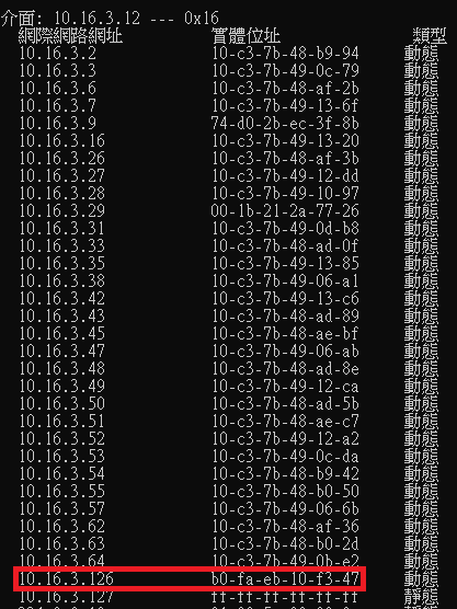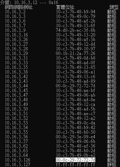 輸入以下指令確認 ARP 路由表