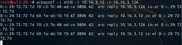 arpspoof -i eth0 -t 10.16.3.12 -r 10.16.3.126