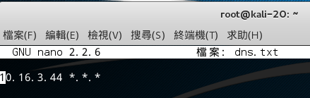 首先持續 ARP 攻擊,並且開啟新的終端機,新增 dns.txt 並且編輯