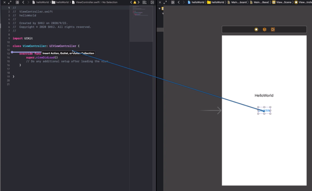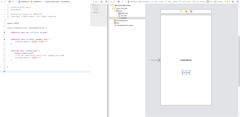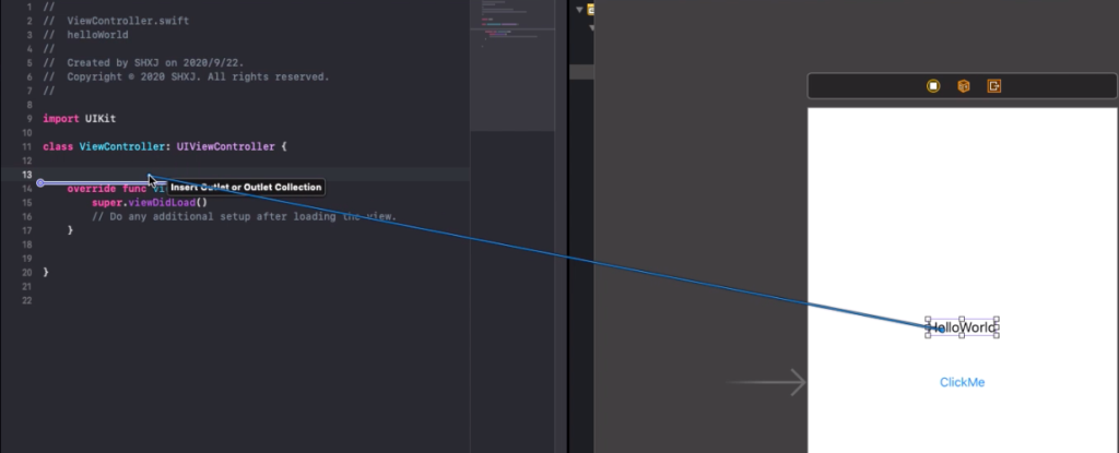 再來選擇 ClickMe 那個按鈕,按著 Ctrl 並且拉到右邊程式碼部分