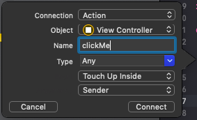 會跳出這個畫面,Connection 選擇事件 (Action),並且輸入變數名稱 clickMe 後按下 Connect