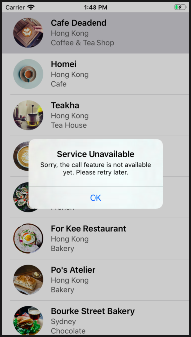 let alertMessage = UIAlertController(title: "Service Unavailable", message: "Sorry, the call feature is not available yet. Please retry later.", preferredStyle: .alert)