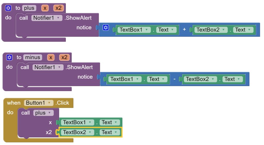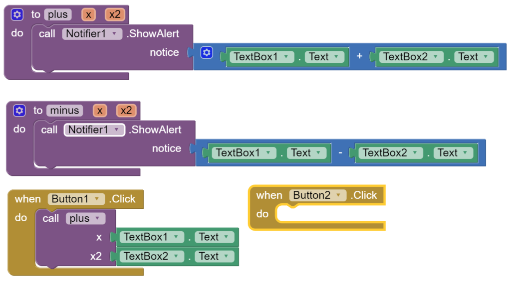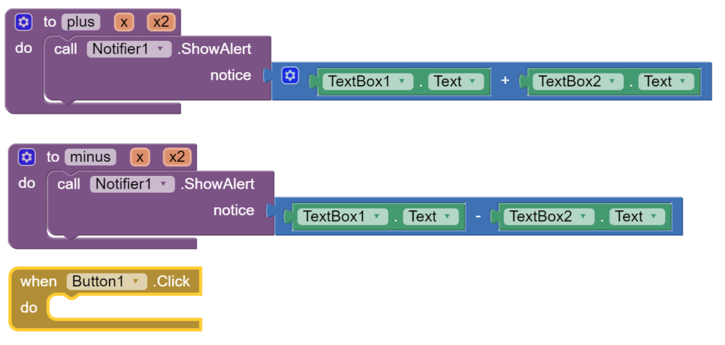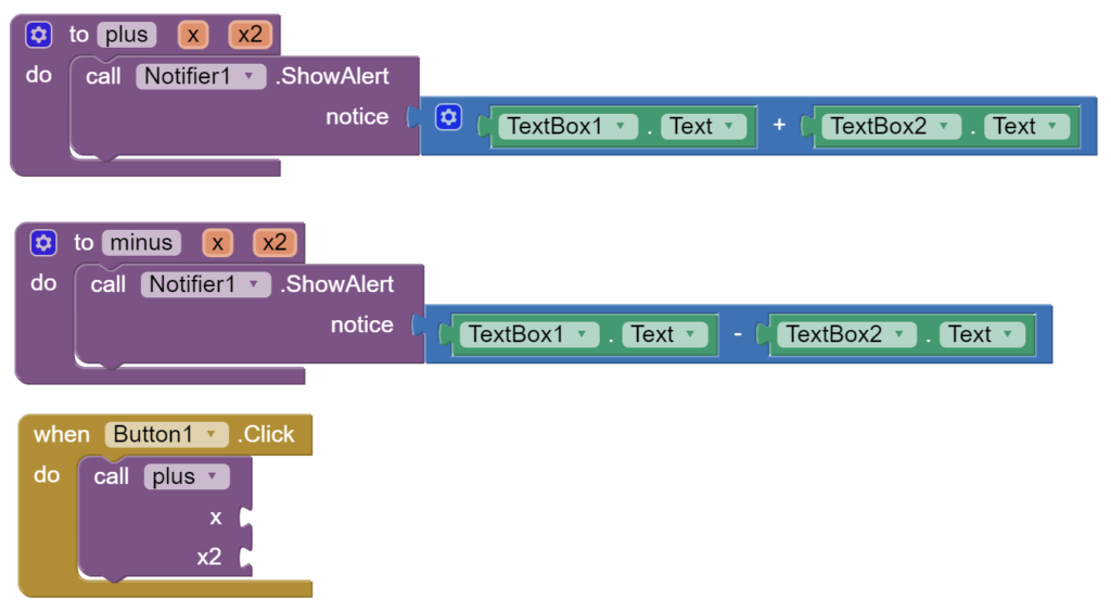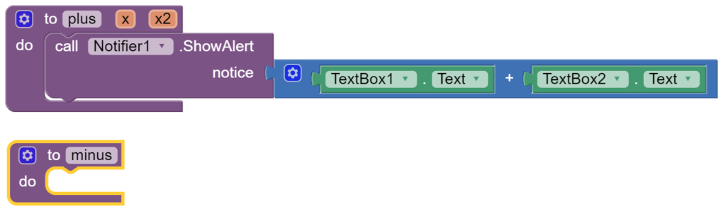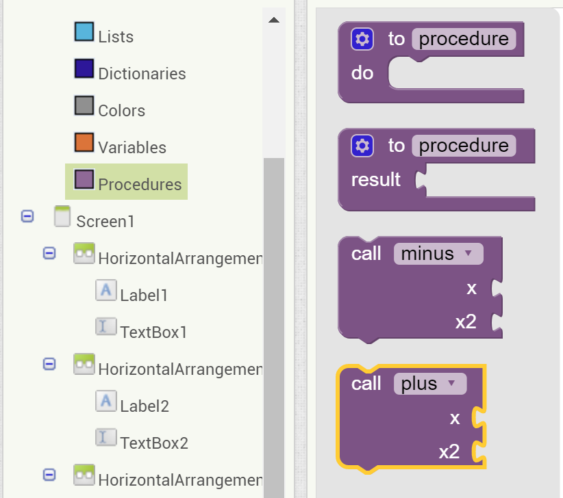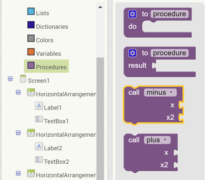 點擊 Procedures (程序) 選擇 call plus 放到 when Button1.Click 裡面