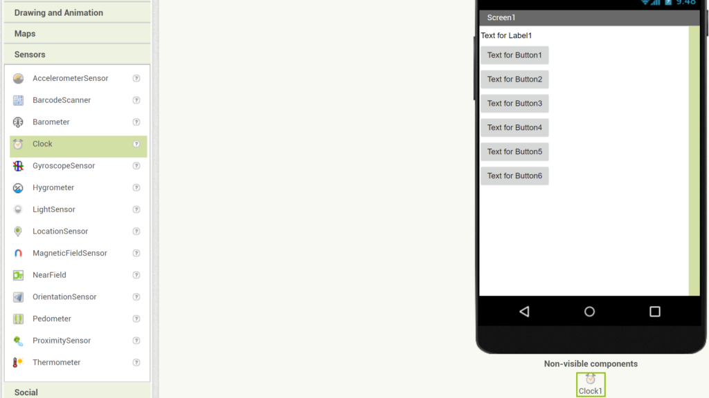 選擇 Sensors 底下的 Clock 放到螢幕上,這是屬於不可視元件