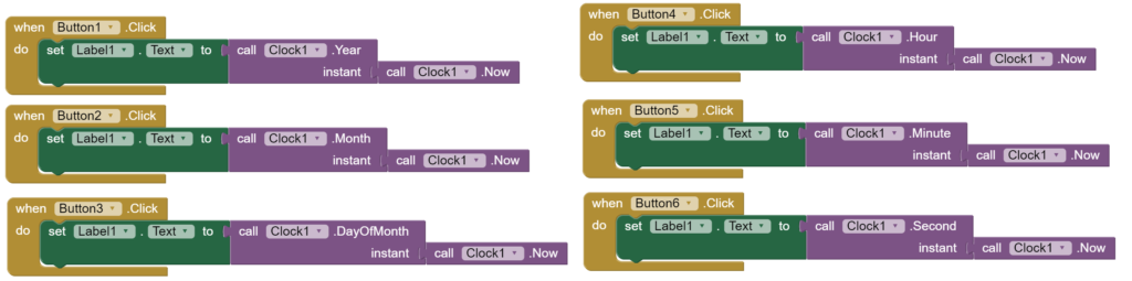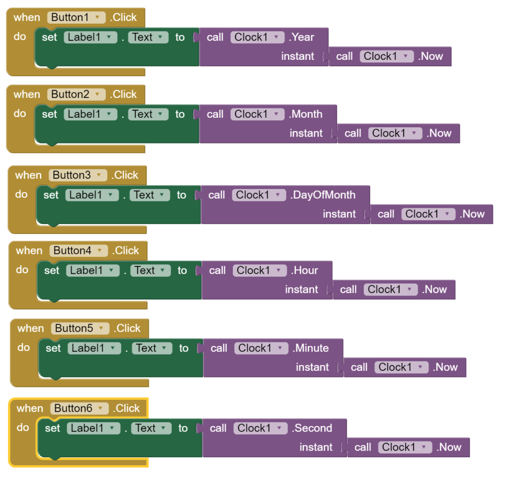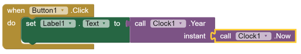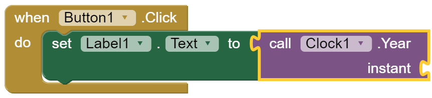 點擊 Clock1 元件,選擇 call Click1.Year instant 放到 to 後面
