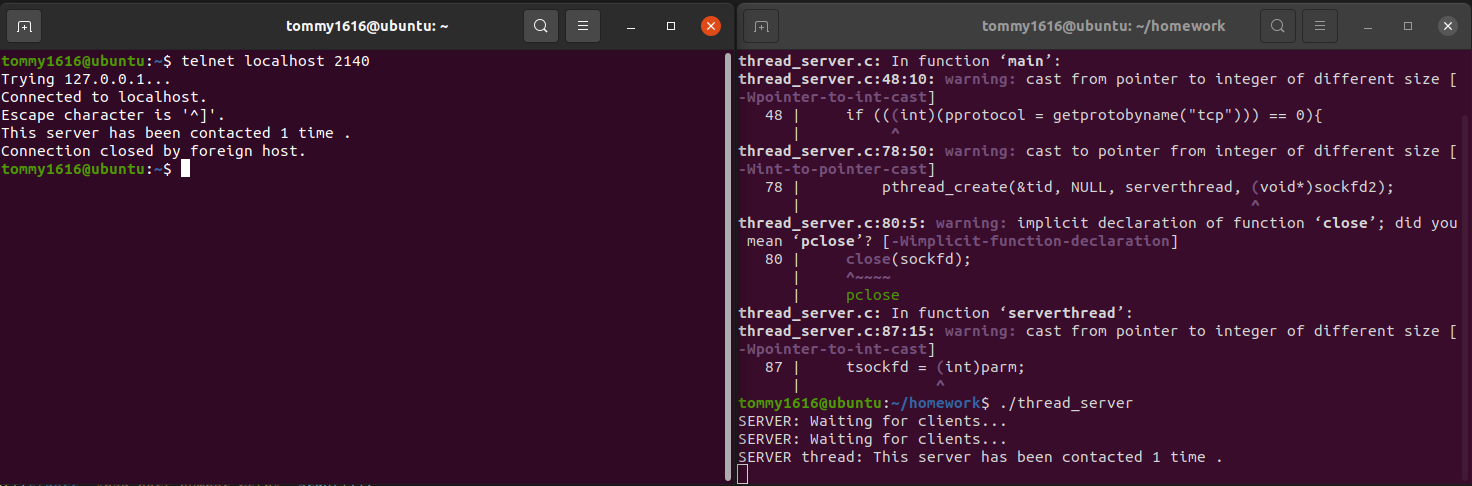 然後開啟新的終端機,並且使用 telnet 連上伺服器