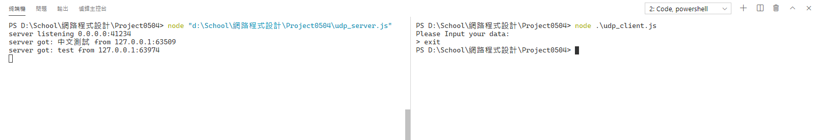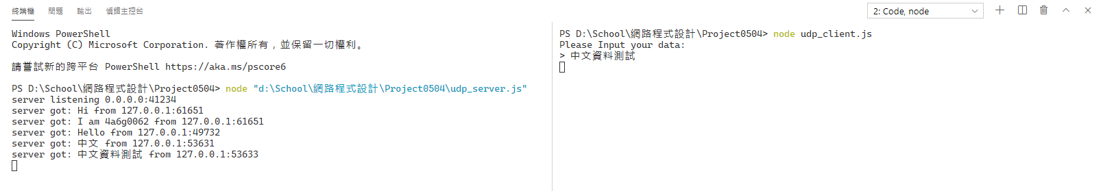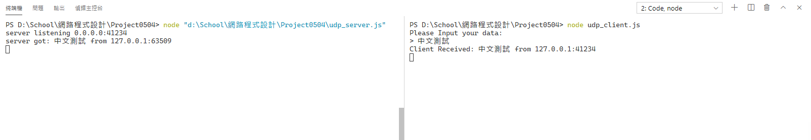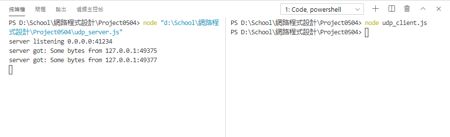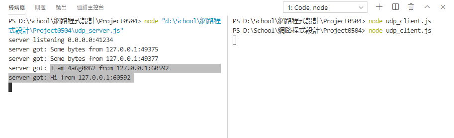 將 udp_client.js 以及 udp_server.js 覆蓋成以下的程式碼