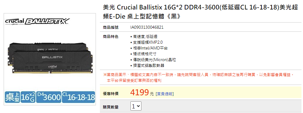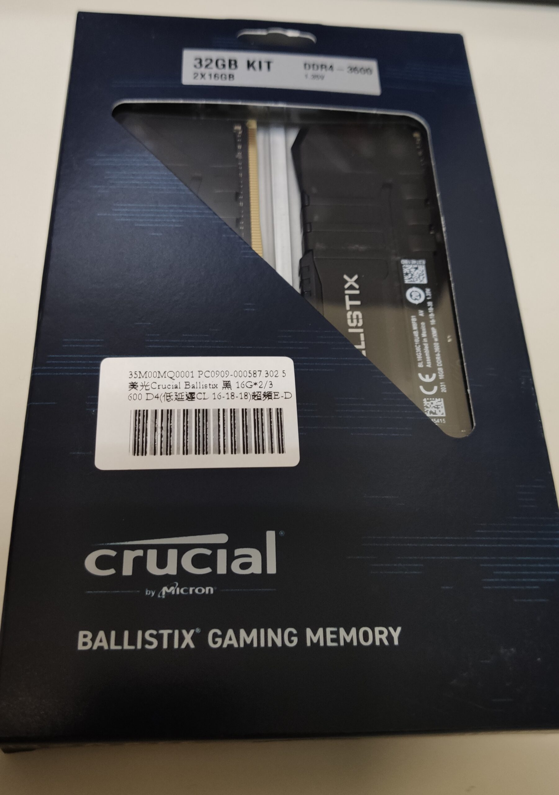 購買的型號 : Crucial Ballistix 32GB Kit ( 2 x 16GB ) DDR4-3600 黑 ( BL2K16G36C16U4B )