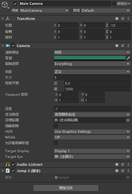 將 Jump2 腳本拉到物件「Main Camera」底下