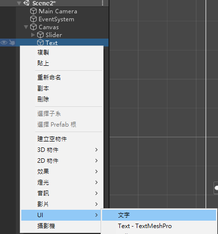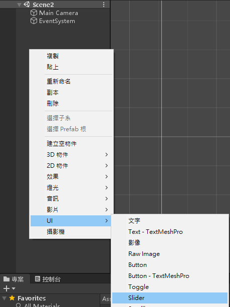 進入 Scene2 場景,「階層」「UI」「Slider」加入 Slider