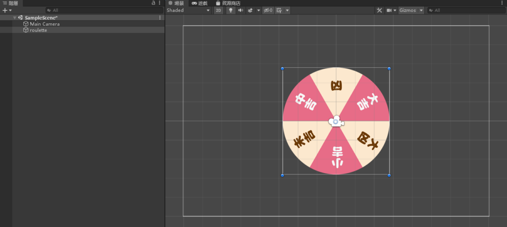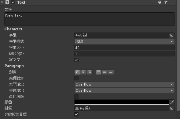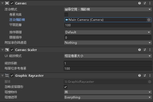 加入一個文字的 UI 在階層視窗,設定 Canvas 的渲染模式為螢幕空間 – 攝影機
