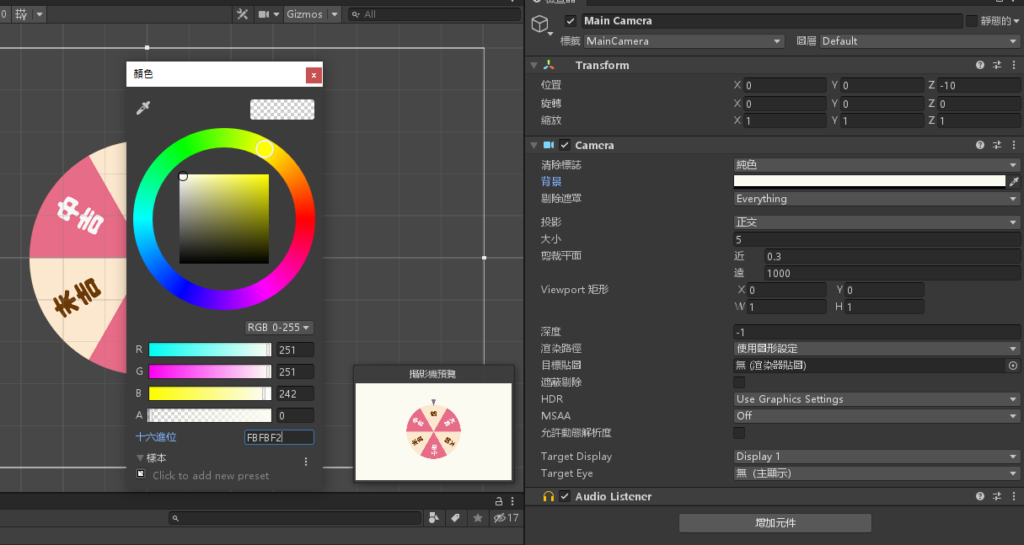 選到階層視窗的 Main Camera ,將背景顏色修改為 FBFBF2 (淺黃色)