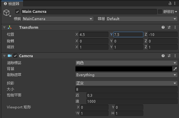 更改 MainCamera 顏色為黑色,大小調整為 8,位置 X = 4.5 ,Y = 7.5