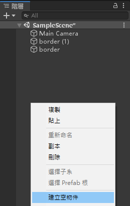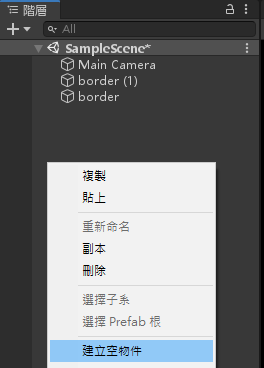 在階層視窗按下滑鼠右鍵>建立空物件