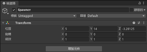 設定 Spawner 屬性,位置 X = 5,Y = 14