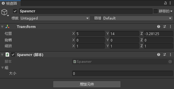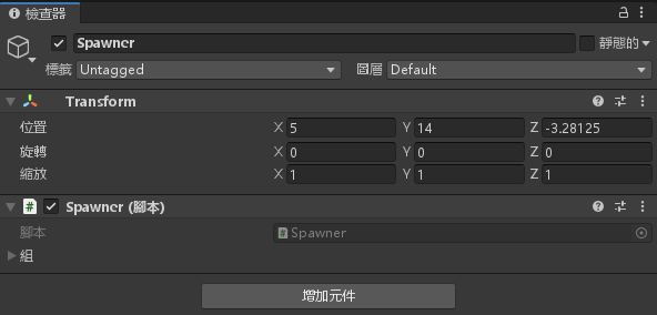 儲存腳本並將 Spawner.cs 腳本拉進 Spawner 物件底下
