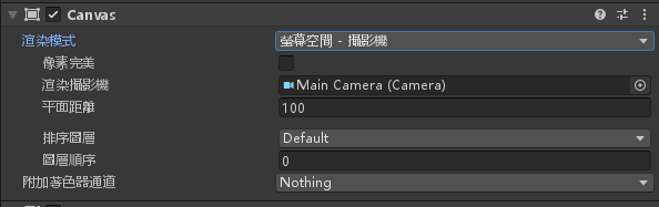設定 Canvas 的渲染模式為螢幕空間 – 攝影機,渲染攝影機設為 MainCamera