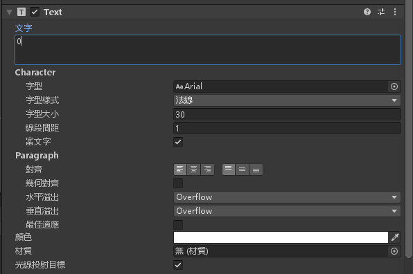 設定 Text 物件的屬性字型大小為30,顏色白色,水平與垂直溢出設定為 Overflow