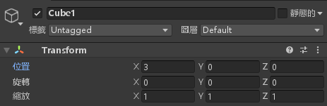 對「Cube1」這個物件設定位置屬性 (3, 0, 0)