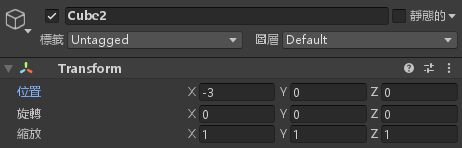 對「Cube2」這個物件設定位置屬性 (-3, 0, 0)