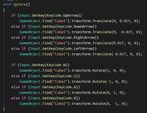 GameObject.Find("Cube1").transform.Translate(-0.01f, 0, 0);