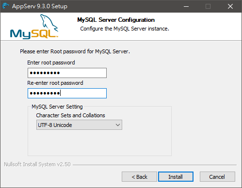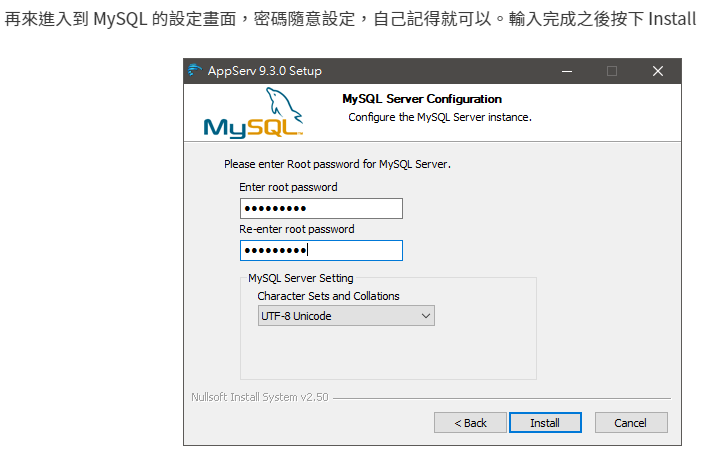 再來進入到 MySQL 的設定畫面,密碼隨意設定,自己記得就可以。輸入完成之後按下 Install