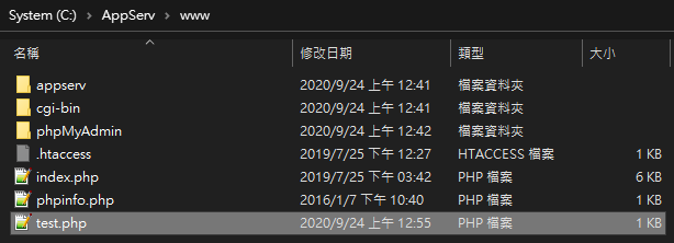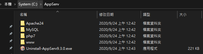 再來進入電腦的路徑 C:\AppServ 底下會有這些資料夾以及檔案