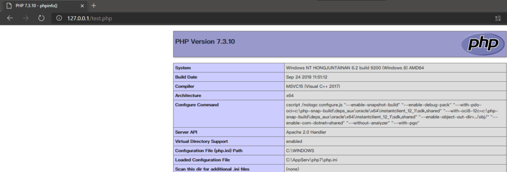 開啟瀏覽器,輸入網址 http://127.0.0.1/test.php,看下以下畫面即表示 PHP 安裝成功