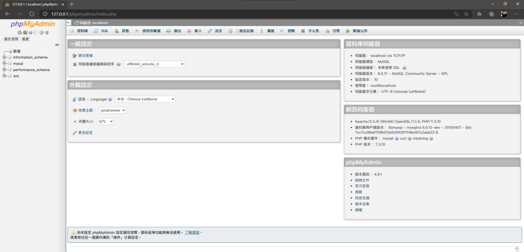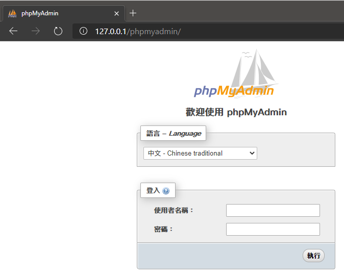 開啟瀏覽器輸入網址 http://127.0.0.1/phpmyadmin ,會看到這個畫面