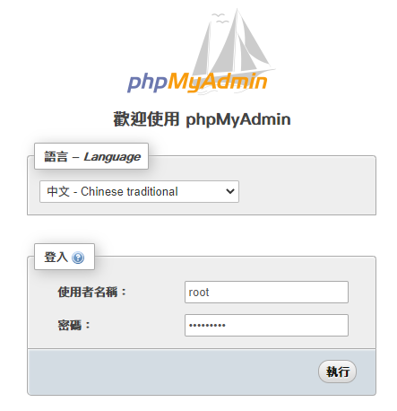 輸入完成之後按下執行,會進入到 MySQL 的管理頁面