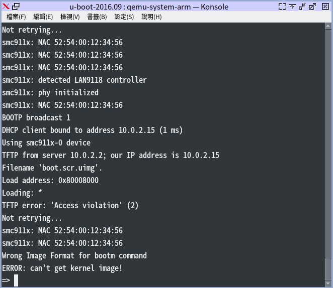 $ qemu-system-arm -machine vexpress-a9 -m 256 -nographic -kernel u-boot