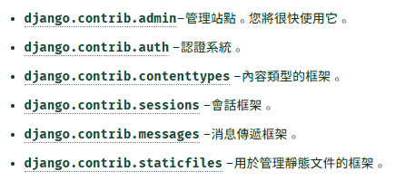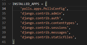 開啟 mysite/settings.py ,找到 INSTALLED_APPS (第33行),加入新的一行設定檔案