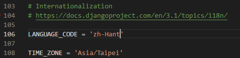 開啟 mysite/settings.py 檔案,修改時區 (第 106、108 行) 為台灣時區