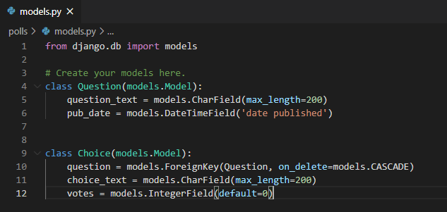 開啟 polls/models.py 檔案,修改成以下程式碼