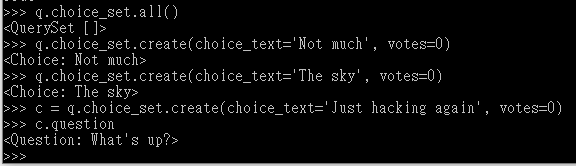 c = q.choice_set.create(choice_text='Just hacking again', votes=0)