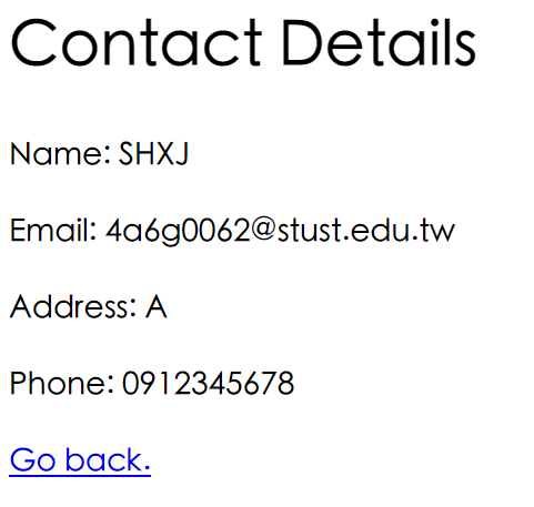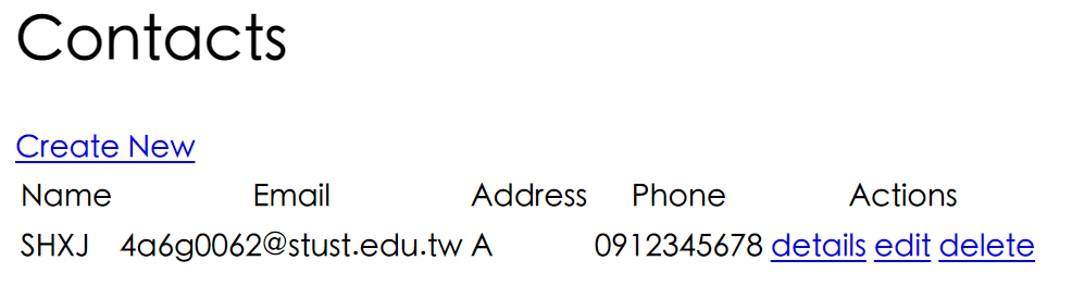 按下 Go back. 或是回到 http://127.0.0.1:8000/contacts/,即可看到剛剛新增的資料