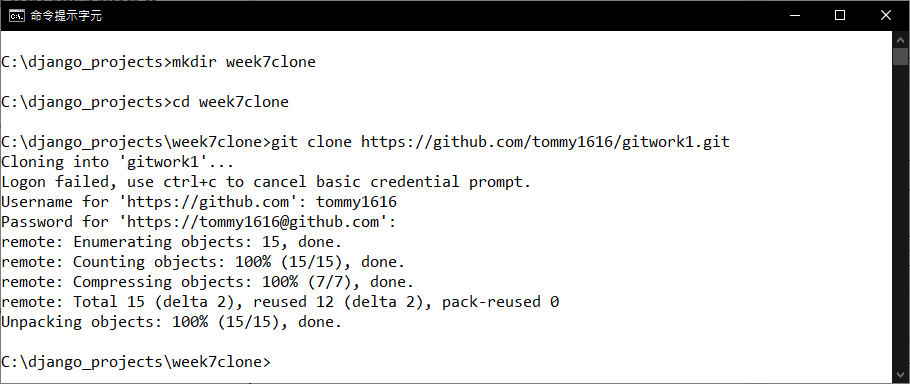 cd .. mkdir week7clone cd week7clone git clone https://github.com/tommy1616/gitwork1.git